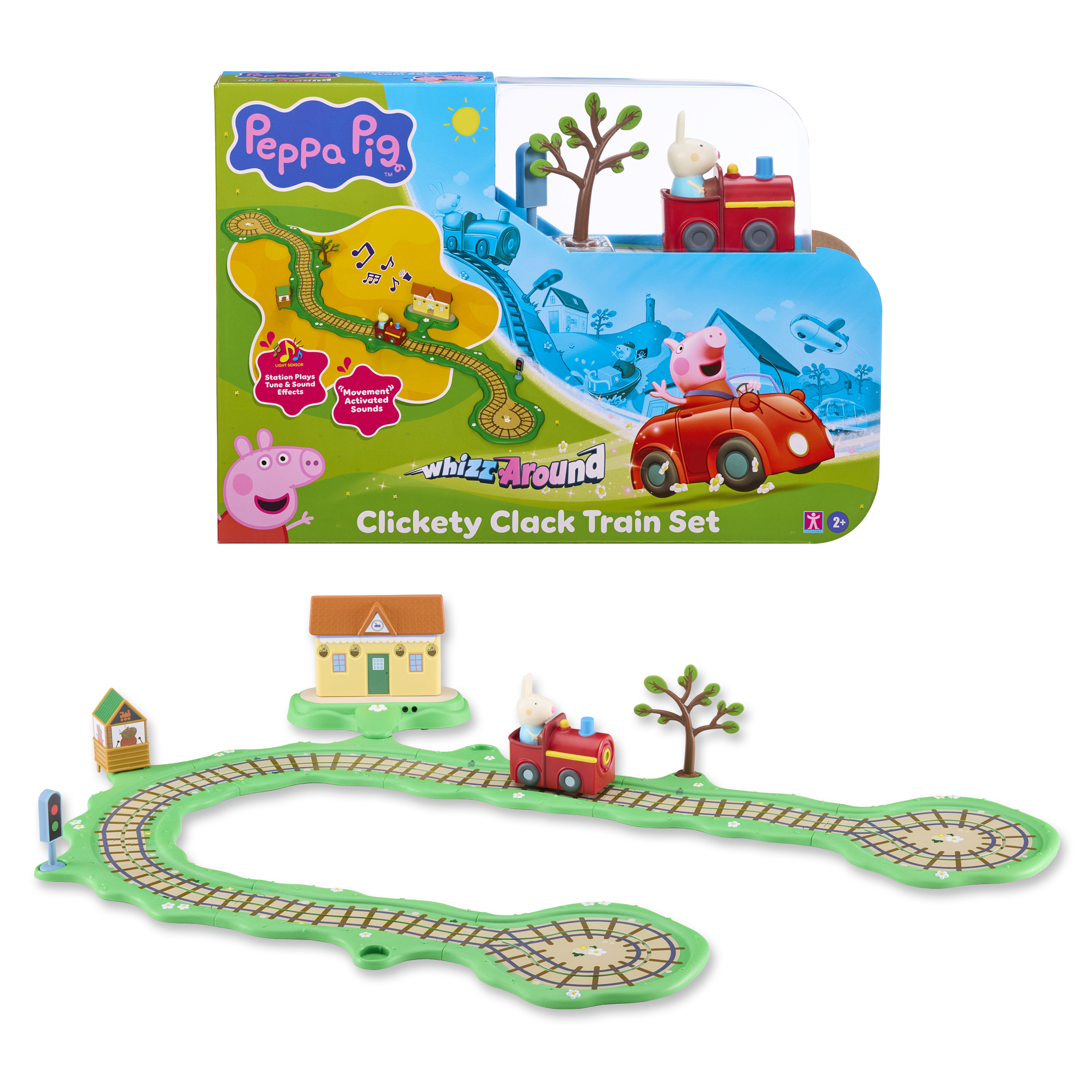 Zestaw kolejowy Peppa Pig Whizz-Around Clickety Clack zawiera mały czerwony pociąg Rebeki Króliczki, tor kolejowy, akcesoria oraz stację kolejową z efektami dźwiękowymi aktywowanymi ruchem! Tor łączy się za pomocą prostego systemu puzzli, który jest idealny dla małych rączek. Dostosuj tory za pomocą akcesoriów. Następnie naciśnij przycisk na pociągu i zobacz, jak Rebecca rusza! Gdy pociąg mija budynek stacji, usłyszysz melodie, frazy i efekty dźwiękowe!